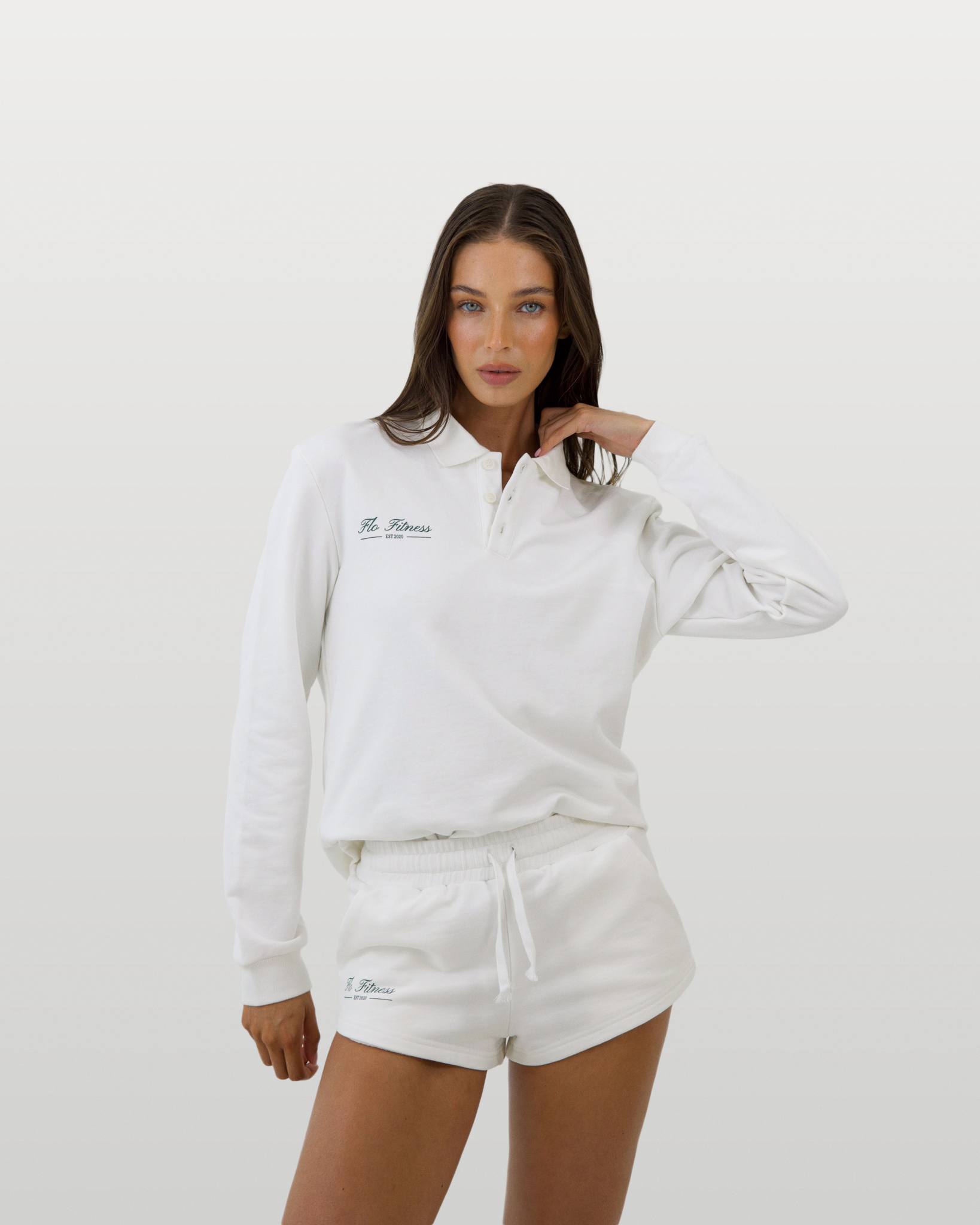 A relaxed-fit sweatshirt made from 100% cotton French Terry. Finished with a polo collar and green embroidered logo for a clean, elevated look you’ll wear on repeat. Pair with our white track shorts for an effortless everyday look.